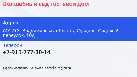 Волшебный сад, гостевой дом по адресу 601293, Владимирская область, Суздаль, Садовый переулок, 10д в дальнейшем Организация, размещена в следующих категориях: