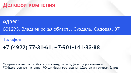 Деловой, компания по адресу 601293, Владимирская область, Суздаль, Садовая, 37 в дальнейшем Организация, размещена в следующих категориях: