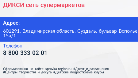 ДИКСИ, сеть супермаркетов по адресу 601291, Владимирская область, Суздаль, бульвар Всполье, 15а/1 в дальнейшем Организация, размещена в следующих категориях: