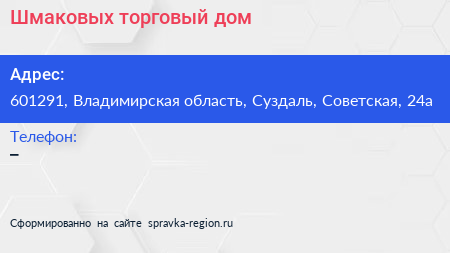 Шмаковых, торговый дом по адресу 601291, Владимирская область, Суздаль, Советская, 24а в дальнейшем Организация, размещена в следующих категориях: