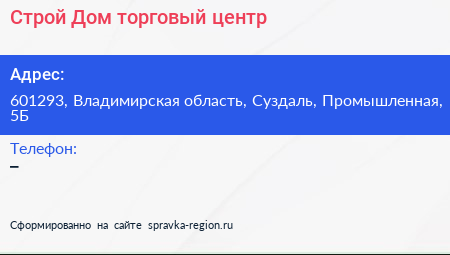 Строй Дом, торговый центр по адресу 601293, Владимирская область, Суздаль, Промышленная, 5Б в дальнейшем Организация, размещена в следующих категориях: