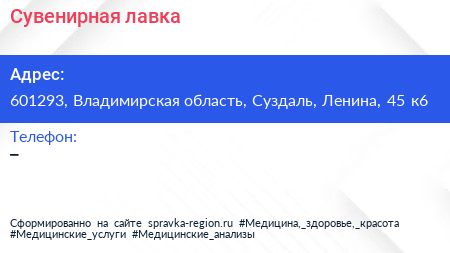 Сувенирная лавка по адресу 601293, Владимирская область, Суздаль, Ленина, 45 к6 в дальнейшем Организация, размещена в следующих категориях: