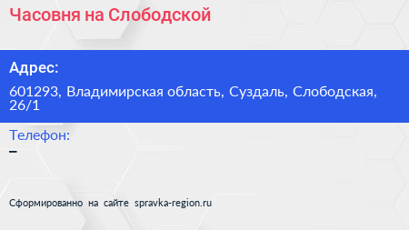 Часовня на Слободской по адресу 601293, Владимирская область, Суздаль, Слободская, 26/1 в дальнейшем Организация, размещена в следующих категориях: