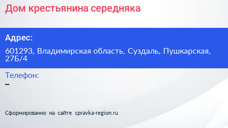 Дом крестьянина-середняка по адресу 601293, Владимирская область, Суздаль, Пушкарская, 27Б/4 в дальнейшем Организация, размещена в следующих категориях:
