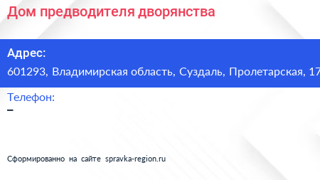 Дом предводителя дворянства по адресу 601293, Владимирская область, Суздаль, Пролетарская, 17 в дальнейшем Организация, размещена в следующих категориях: