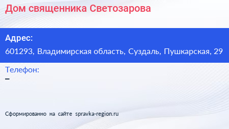 Дом священника Светозарова по адресу 601293, Владимирская область, Суздаль, Пушкарская, 29 в дальнейшем Организация, размещена в следующих категориях: