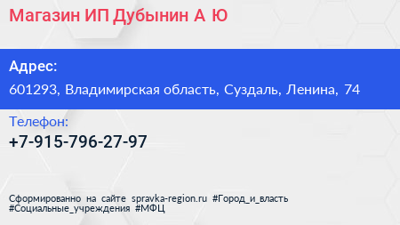 Магазин, ИП Дубынин А.Ю. по адресу 601293, Владимирская область, Суздаль, Ленина, 74 в дальнейшем Организация, размещена в следующих категориях: