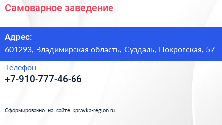 Самоварное заведение по адресу 601293, Владимирская область, Суздаль, Покровская, 57 в дальнейшем Организация, размещена в следующих категориях:
