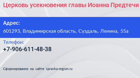 Церковь усекновения главы Иоанна Предтечи по адресу 601293, Владимирская область, Суздаль, Ленина, 55а в дальнейшем Организация, размещена в следующих категориях: