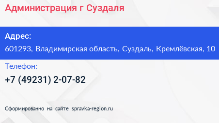 Администрация г. Суздаля по адресу 601293, Владимирская область, Суздаль, Кремлёвская, 10 в дальнейшем Организация, размещена в следующих категориях: