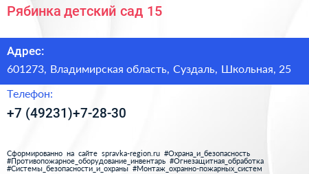 Рябинка, детский сад №15 по адресу 601273, Владимирская область, Суздаль, Школьная, 25 в дальнейшем Организация, размещена в следующих категориях: