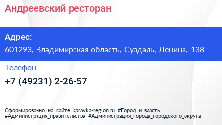 Андреевский, ресторан по адресу 601293, Владимирская область, Суздаль, Ленина, 138 в дальнейшем Организация, размещена в следующих категориях: