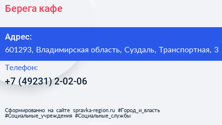 Берега, кафе по адресу 601293, Владимирская область, Суздаль, Транспортная, 3 в дальнейшем Организация, размещена в следующих категориях: