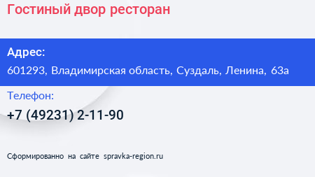 Гостиный двор, ресторан по адресу 601293, Владимирская область, Суздаль, Ленина, 63а в дальнейшем Организация, размещена в следующих категориях: