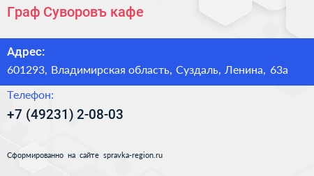 Граф Суворовъ, кафе по адресу 601293, Владимирская область, Суздаль, Ленина, 63а в дальнейшем Организация, размещена в следующих категориях: