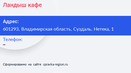 Ландыш, кафе по адресу 601293, Владимирская область, Суздаль, Нетека, 1 в дальнейшем Организация, размещена в следующих категориях: