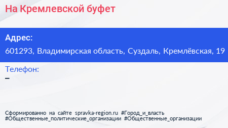 На Кремлевской, буфет по адресу 601293, Владимирская область, Суздаль, Кремлёвская, 19 в дальнейшем Организация, размещена в следующих категориях: