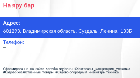 На яру, бар по адресу 601293, Владимирская область, Суздаль, Ленина, 133Б в дальнейшем Организация, размещена в следующих категориях: