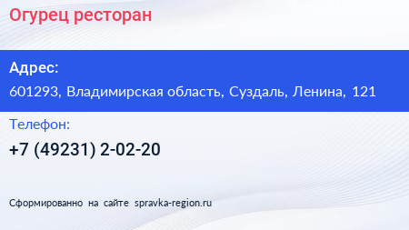 Огурец, ресторан по адресу 601293, Владимирская область, Суздаль, Ленина, 121 в дальнейшем Организация, размещена в следующих категориях: