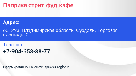 Паприка, стрит-фуд кафе по адресу 601293, Владимирская область, Суздаль, Торговая площадь, 2 в дальнейшем Организация, размещена в следующих категориях: