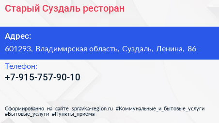 Старый Суздаль, ресторан по адресу 601293, Владимирская область, Суздаль, Ленина, 86 в дальнейшем Организация, размещена в следующих категориях: