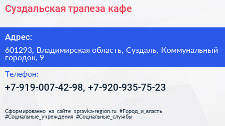 Суздальская трапеза, кафе по адресу 601293, Владимирская область, Суздаль, Коммунальный городок, 9 в дальнейшем Организация, размещена в следующих категориях: