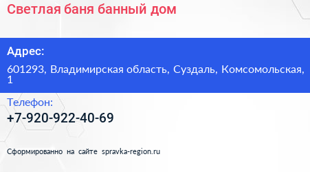 Светлая баня, банный дом по адресу 601293, Владимирская область, Суздаль, Комсомольская, 1 в дальнейшем Организация, размещена в следующих категориях: