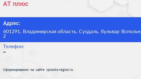 АТ плюс по адресу 601291, Владимирская область, Суздаль, бульвар Всполье, 2 в дальнейшем Организация, размещена в следующих категориях: