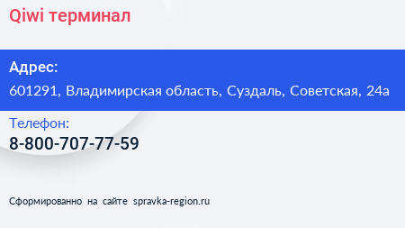 Qiwi, терминал по адресу 601291, Владимирская область, Суздаль, Советская, 24а в дальнейшем Организация, размещена в следующих категориях: