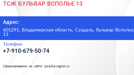 ТСЖ БУЛЬВАР ВСПОЛЬЕ, 13 по адресу 601291, Владимирская область, Суздаль, бульвар Всполье, 13 в дальнейшем Организация, размещена в следующих категориях: