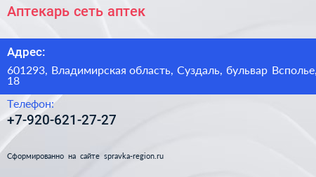 Аптекарь, сеть аптек по адресу 601293, Владимирская область, Суздаль, бульвар Всполье, 18 в дальнейшем Организация, размещена в следующих категориях: