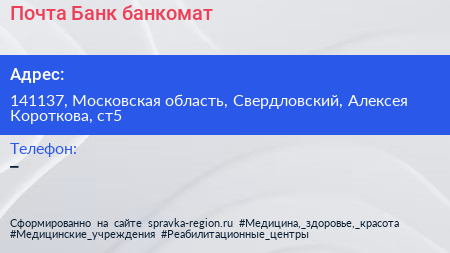 Почта Банк, банкомат по адресу 141137, Московская область, Свердловский, Алексея Короткова, ст5 в дальнейшем Организация, размещена в следующих категориях: