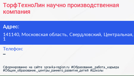 ТорфТехноЛин, научно-производственная компания по адресу 141140, Московская область, Свердловский, Центральная, 1 в дальнейшем Организация, размещена в следующих категориях: