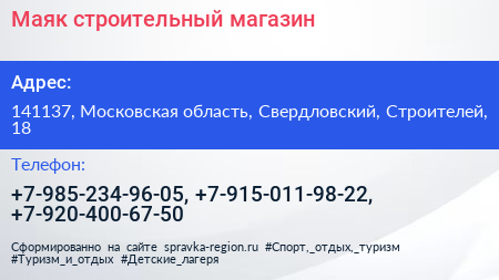 Маяк, строительный магазин по адресу 141137, Московская область, Свердловский, Строителей, 18 в дальнейшем Организация, размещена в следующих категориях: