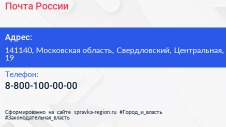 Почта России по адресу 141140, Московская область, Свердловский, Центральная, 19 в дальнейшем Организация, размещена в следующих категориях: