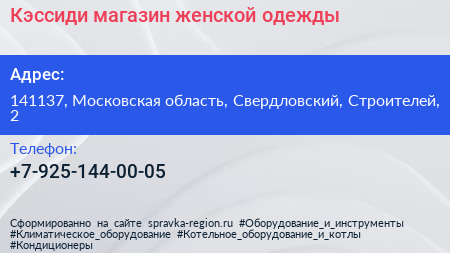 Кэссиди, магазин женской одежды по адресу 141137, Московская область, Свердловский, Строителей, 2 в дальнейшем Организация, размещена в следующих категориях: