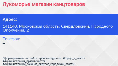 Лукоморье, магазин канцтоваров по адресу 141140, Московская область, Свердловский, Народного Ополчения, 2 в дальнейшем Организация, размещена в следующих категориях: