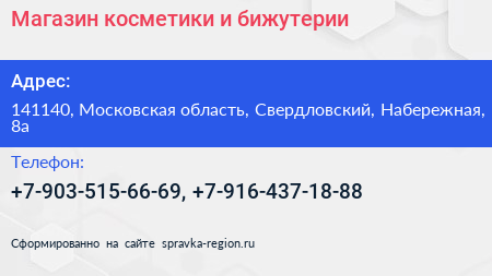 Магазин косметики и бижутерии по адресу 141140, Московская область, Свердловский, Набережная, 8а в дальнейшем Организация, размещена в следующих категориях: