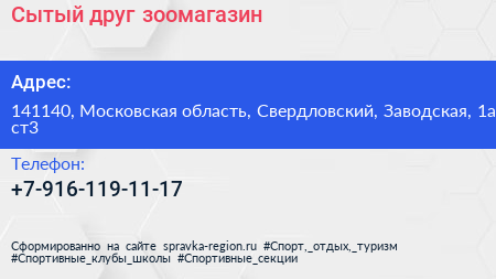 Сытый друг, зоомагазин по адресу 141140, Московская область, Свердловский, Заводская, 1а ст3 в дальнейшем Организация, размещена в следующих категориях: