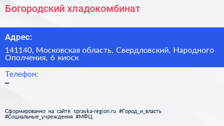 Богородский хладокомбинат по адресу 141140, Московская область, Свердловский, Народного Ополчения, 6 киоск в дальнейшем Организация, размещена в следующих категориях: