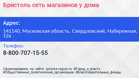 Бристоль, сеть магазинов у дома по адресу 141140, Московская область, Свердловский, Набережная, 12а в дальнейшем Организация, размещена в следующих категориях: