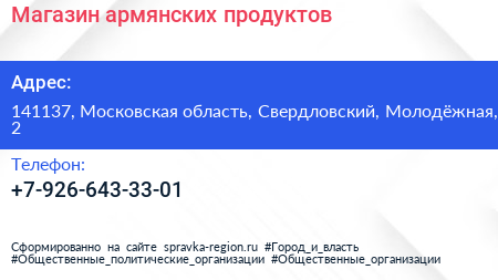 Магазин армянских продуктов по адресу 141137, Московская область, Свердловский, Молодёжная, 2 в дальнейшем Организация, размещена в следующих категориях: