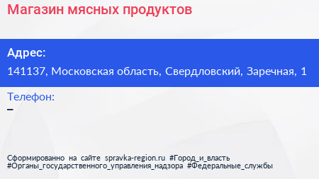Магазин мясных продуктов по адресу 141137, Московская область, Свердловский, Заречная, 1 в дальнейшем Организация, размещена в следующих категориях: