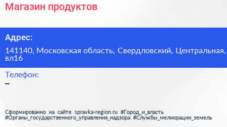 Магазин продуктов по адресу 141140, Московская область, Свердловский, Центральная, вл16 в дальнейшем Организация, размещена в следующих категориях:
