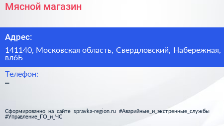 Мясной магазин по адресу 141140, Московская область, Свердловский, Набережная, вл6Б в дальнейшем Организация, размещена в следующих категориях: