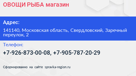 ОВОЩИ & РЫБА, магазин по адресу 141140, Московская область, Свердловский, Заречный переулок, 2 в дальнейшем Организация, размещена в следующих категориях: