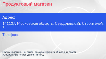 Продуктовый магазин по адресу 141137, Московская область, Свердловский, Строителей, 1 в дальнейшем Организация, размещена в следующих категориях: