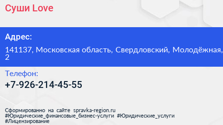 Суши Love по адресу 141137, Московская область, Свердловский, Молодёжная, 2 в дальнейшем Организация, размещена в следующих категориях: