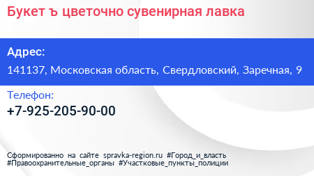 Букет`ъ, цветочно-сувенирная лавка по адресу 141137, Московская область, Свердловский, Заречная, 9 в дальнейшем Организация, размещена в следующих категориях:
