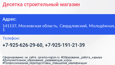 Десятка, строительный магазин по адресу 141137, Московская область, Свердловский, Молодёжная, 1 в дальнейшем Организация, размещена в следующих категориях: